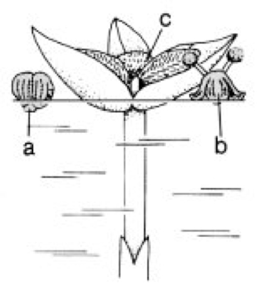 Bestäubungsvorgang bei Vallisneria spiralis (Wasserschraube). a staminate Blüte in Knospe, b staminate Blüte aufgeblüht, c karpellate Blüte