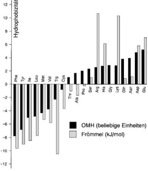 Das Diagramm gibt die Hydrophobizität der proteinogenen Aminosäuren sowohl in der OMH- als auch in der Frömmel-Skala an. Die Frömmel-Skala stellt die freie Energie (Enthalpie, Entropie) beim Transfer einer Aminosäure von einem hydrophoben Medium in Wasser dar. Dieser Wert bezieht sich auf die intrinsische Eigenschaft einer Aminosäure, isoliert von einem Protein betrachtet, also eine rein physikalische Eigenschaft. Die OMH-Skala dagegen ist die Messung der Wahrscheinlichkeit, mit der eine bestimmte Aminosäure in einem Protein gegen eine andere hydrophobe Aminosäure ausgetauscht wird, also eine evolutionäre Betrachtung. Aminosäuren sind nicht immer leicht einzuordnen, wie z.B. Arginin, das definitionsgemäß eine geladene, polare Aminosäure ist. Wegen seiner langen aliphatischen Seitenkette kann Arginin aber eher nicht-polare Aminosäuren in einem Protein ersetzen als Glutamat (Glutaminsäure), das rein aufgrund seiner polaren Eigenschaften vergleichbar wäre.