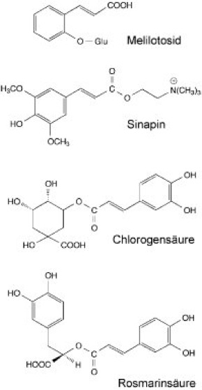 Hydroxyzimtsäuren, ubiquitär verbreitete, zentrale Pflanzeninhaltsstoffe an der Nahtstelle von Primär- und Sekundärstoffwechsel. Hydroxyzimtsäuren gehören zur großen Gruppe der Phenylpropane und enthalten einen Phenylrest und eine α,β-ungesättigte C3-Seitenkette mit einer Carbonsäurefunktion. Alle Hydroxyzimtsäuren leiten sich biosynthetisch von Zimtsäure (gebildet durch die Phenylalanin-Ammonium-Lyase) oder p-Cumarsäure (gebildet durch die Tyrosin-Ammonium-Lyase) durch Hydroxylierung und Methylierung ab. Die Enzyme für Hydroxylierung und Methylierung sind weitgehend bekannt. Neben den aufgeführten Verbindungen ( ä vgl. Tab. ) gibt es nur noch wenige Strukturvarianten (z.B. Sphagnumsäure [p-Hydroxy(β-Carboxymethyl)-Zimtsäure]). Im allgemeinen liegen Hydroxyzimtsäuren und deren Abkömmlinge in den Zellen als wasserlösliche (hydrophile) Derivate vor (Glykoside und andere Konjugate). Die biochemische Modifikation von (methylierten) Hydroxyzimtsäuren (z.B. Reduktion zu Alkoholen) und die Konjugation erfordern in der Regel eine zuvorige Aktivierung in Form der CoA-Thioester. Hydroxyzimtsäure-Derivate und -Konjugate ( ä vgl. Abb. ) finden sich hauptsächlich in der Vakuole und in der Zellwand. Für die Synthese von Lignin sind die 4-O-(β-D)-Glucopyranoside des Cumarylalkohols, des Coniferylalkohols und des Sinapylalkohols die Transportform in die Zellwand. Die Alkohole entstehen jeweils durch zweistufige Reduktion der Carboxylsäuren. In der Zellwand erfolgt die Spaltung der Glucoside durch spezifische β-Glucosidasen. Ein anderes Beispiel für ein Hydroxyzimtsäure-Glucosid ist Melilotosid (2-O-[β-D-Glucopyranosyl]-o-Cumarsäure). Eine andere Form der Derivatisierung ist die Konjugation mit Hydroxyverbindungen in Form von Estern. Reaktionspartner hierfür sind z.B. Flavonoide, Anthocyane, Alkaloide, Iridoide, verschiedene Zucker, Cholin (z.B. Sinapin [Sinapinsäure-Cholinester]) und Hydroxycarbonsäuren: aliphatische (z.B. Chicoreesäure [Di-Caffeoyl-(S,S)-Weinsäure]), alicyclische (z.B. Chlorogensäure [5-O-Caffeoyl-D-Chinasäure]) oder aromatische (z.B. Rosmarinsäure [2-O-Caffeoyl-3-(3,4-Dihydroxyphenyl)-Milchsäure]). In reproduktiven Organen findet man des weiteren auch Amide mit den AminenSpermin, Spermidin, Putrescin und Tyramin. Von den Hydroxyzimtsäuren leiten sich zahlreiche weitere sekundäre Pflanzenstoffe ab: CoA-Thioester, Hydroxybenzoesäuren, Benzylalkohole, Lignin, Lignane, Cumarine und Umsetzungsprodukte mit Malonyl-CoA (Flavonoide, Anthocyane, Benzophenone, Stilbene). Hydroxyzimtsäuren und Hydroxyzimtsäure-Derivate üben neben ihrer zentralen Bedeutung als biochemische Bausteine zahlreiche weitere biologische Funktionen aus. Sie weisen eine inhibitorische Wirkung gegenüber zahlreichen Pilzen und Bakterien auf und unterstützen somit die Pathogenabwehr. Manche Hydroxyzimtsäuren zeigen antivirale Wirkung. Des weiteren gibt es Hydroxyzimtsäuren mit abstoßender oder anziehender Wirkung auf Insekten. Sie fungieren zudem als Allelopathika (Allelo-Chemikalien, Allelopathie) bei der gegenseitigen inner- oder zwischenartlichen Beeinflussung von Pflanzenindividuen. Hydroxyzimtsäuren wirken als zelluläre Antioxidantien (freie Radikale) und als UV-Strahlen-Filter in der Epidermis. Zahlreiche Hydroxyzimtsäuren sind aufgrund dieser Eigenschaften von pharmakologischem Interesse, z.B. als Hautlichtschutzfaktor, zur Entzündungshemmung (Rosmarinsäure, Kaffeesäure) oder als Magensekretionsstimulans.
