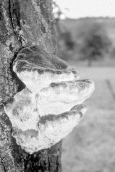 Hymenochaetaceae [von *hymeno- , griech. chaitē = Borste], Familie der Klasse Hymenomycetes, Ordnung Hymenochaetales (oder meist noch in die Ordnung Nichtblätterpilze [Aphyllophorales] eingeordnet); viele Arten ( vgl. Tab. ) weltweit verbreitet. Charakteristisch ist die braungefärbte Trama (durch Styrylpyrone), die sich mit Kalilauge violett-schwarz verfärbt; an den Hyphensepten fehlen Schnallen. Die ein- oder mehrjährigen Fruchtkörper sind konsolen-, seltener krustenförmig, vereinzelt mit gestieltem Hut; Hymenophor glatt oder röhrig ausgebildet. Fast alle Arten wachsen parasitisch oder saprophytisch an Holz (Erreger von Weißfäule; vgl. Abb. ). Die einfachsten Hymenochaetaceaen stellen die Hymenochaete-Arten dar, häutige bis lederartige Formen mit glattem oder runzeligem Hymenium, das braune, borstenähnliche Cystiden trägt; die ca. 8 Arten sind Holzbewohner. Weit verbreitet wächst Hymenochaete rubiginosa Lév., der Rotbraune Borstenscheibling, fast ausschließlich an totem, entrindetem Holz von Eichen und Edelkastanien.