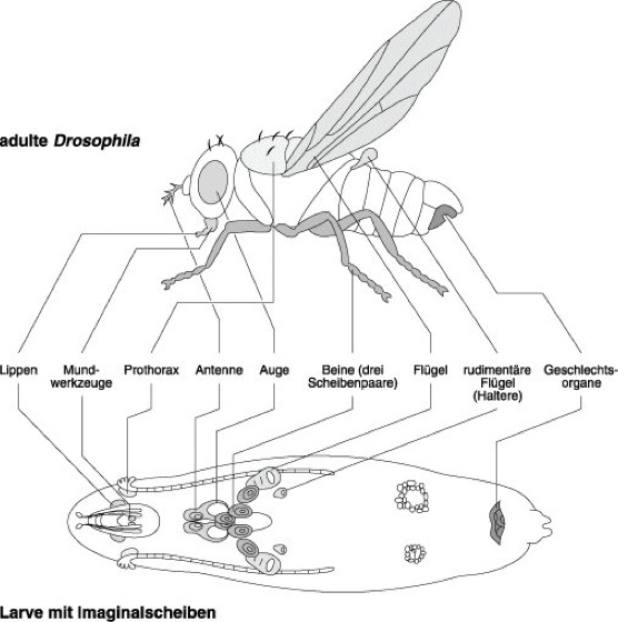 Imaginalscheiben [von *imagin- ], Gruppen ektodermaler Zellen bei Höheren Insekten (vor allem Schmetterlingen, Zweiflüglern und Hautflüglern), aus denen die Körperteile des adulten Tieres (Imago) hervorgehen ( vgl. Abb. ). Die Imaginalscheiben entstehen während der Embryonalentwicklung meist als Einstülpung des Ektoderms (Ausnahme z.B. Histoblasten) und liegen dann in der Körperhöhle der Larve als etwa ein Dutzend paarige Epithelsäckchen vor, die vor allem am Gehirn und an den Tracheen befestigt sind. Dort verharren sie im embryonalen Differenzierungszustand bis kurz vor der Puppenruhe (Puppe). Schon davor beginnnen sie heranzuwachsen, stülpen sich dann während der Metamorphose wieder aus, differenzieren sich und bilden die Körperoberfläche der Adultform. Auch Teile der inneren Organe entstehen in der Metamorphose (Farbtafel) aus solchen Anlagen. Für die Determinierung des Entwicklungsschicksals der Imaginalscheiben sind die homöotischen Gene (HOM-C, Hox-Gene) von entscheidender Bedeutung. Imaginalscheibenartige Adultanlagen kommen vereinzelt auch in anderen Tierstämmen vor, z.B. bei Schnurwürmern. Entwicklungsphysiologisch sind die Imaginalscheiben vor allem dadurch interessant, daß sie sich in Larven jahrelang unter Zellvermehrung züchten lassen und dabei meist ihren Determinationszustand (Determination) aufrechterhalten (z.B. für Flügel, Bein o.ä., Nachweis durch anschließende Metamorphose mit Bildung entsprechender Cuticularstrukturen). Ändert sich der Determinationzustand, so schlägt er in der Regel in denjenigen einer anderen Scheibe um (Transdetermination). Anlageplan (Abb.), Flügelanlagen, Holometabola, Weismann (A.F.L.).