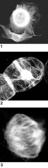 1 Leberzellkultur, die für Mikrotubuli gefärbt wurde. 2 Tabakzellkultur, die sich vor der Teilung befindet und das sog. Präprophaseband gebildet hat, das danach senkrecht dazu die Teilungsspindel (3) organisieren wird.