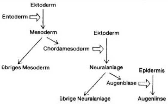 Induktionskette in der Embryogenese der Urodelen (Schwanzlurche), nach Spemann und Nieuwkoop. Offene Pfeile: Induktionsreize, dünne Pfeile: Entwicklungsschritte