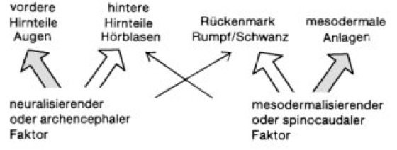 Zusammenwirken von 2 Induktionsstoffen als musterbildendes Prinzip beim Molch (nach Tiedemann, Saxen, Toivonen). Oben induzierte Strukturen, unten Induktoren. Die „Intensität“ der Pfeile symbolisiert das Mischungsverhältnis der beiden Induktionsstoffe.