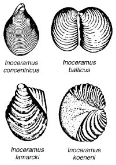 Inoceramusm [von *ino- , griech. keramos = Töpferware], (J. Sowerby 1814), Nominatgattung der anisomyaren ausgestorbenen Muschel-Familie Inoceramidae Giebel 1852, Unterordnung Pterioida Newell 1965 (Unter-Perm bis Ober-Kreide) mit meist eiförmiger, fast gleich- bis stark ungleichklappiger Schale, konzentrisch verziert, Schloßrand zahnlos mit zahlreichen vertikalen Bandgruben. Schale aus parallelen, dünnen Calcitprismen, die bei der Verwesung auseinanderfallen und dann gesteinsbildend werden. Inoceramus wurde bis heute in zahlreiche weitere Gattungen und Untergattungen aufgespalten. Verbreitung: Unter-Jura bis Ober-Kreide; Blütezeit und Riesenformen bis über 50 cm Klappenlänge in der Ober-Kreide mit zahlreichen kurzlebigen Formen von hohem Leitwert ( vgl. Abb. ), kosmopolitisch.
