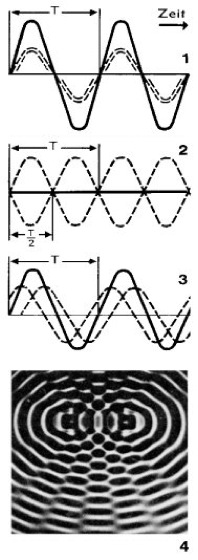 Interferenz zweier Wellen bzw. Schwingungen (T = Schwingungsdauer): 1 Phasenunterschied (Gangunterschied) von 0 Grad (maximale Verstärkung), 2 von 180 Grad (Auslöschung), 3 von 90 Grad. 4 Aufnahme einer Wasseroberfläche mit dem Interferenzmuster von 2 darüber wandernden Wellenzügen, die von 2 getrennten Punkten ausgehen.