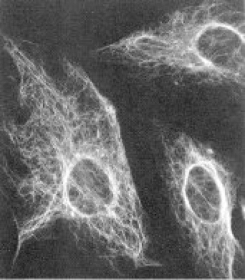 Vimentinfilamente in Gewebekultur-Zellen (PtK-Zellen), sichtbar gemacht durch indirekte Immunfluoreszenz