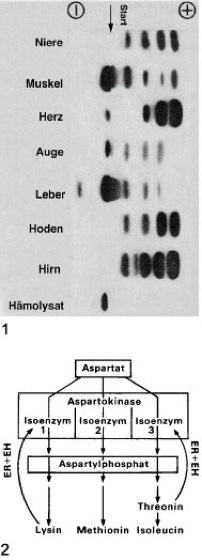 Gewebsvariabilität der Lactat-Dehydrogenase (Milchsäure-Dehydrogenase) bei der Erdmaus (Microtus agrestis). 2 Feinregulation verzweigter Biosyntheseketten durch Isoenzyme am Beispiel der Aspartatfamilie. Auch die Synthese von Methionin und Isoleucin unterliegt einer Feinregulation über Isoenzyme, die jedoch komplizierter ist und hier nicht berücksichtigt ist. (ER = Endproduktrepression, EH = Endprodukthemmung)