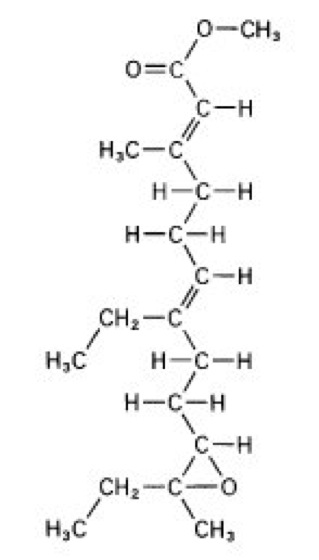 Juvenilhormon, Abk. JH, Neotenin, Isoprenoid- bzw. Terpenoidhormon (Insektenhormone) der Corpora allata (CA) der Insekten. Während des Larvenstadiums (LS) kontrolliert JH im Zusammenspiel mit Ecdyson (Ecdysteroide) die Metamorphose, indem es die Adult-Häutung verhindert. Im Adultstadium ist JH ein Sexualhormon, das maßgeblich an der Synthesekontrolle von Proteinen beteiligt ist, die der Fortpflanzung dienen. Hierzu gehören das im weiblichen Fettkörper gebildete Dotterprotein Vitellogenin, das in den Ovidukten gebildete Kokonschaumsekret, in das die Eier bei der Ablage eingebettet werden, und die Synthese von Proteinen in den männlichen akzessorischen Drüsen (Geschlechtsorgane), die zur Bildung von Spermatophoren benötigt werden. JH kontrolliert bei vielen Insekten auch das Paarungsverhalten und die Produktion von Pheromonen. Die Bedeutung des JH für obengenannte Prozesse ist artspezifisch unterschiedlich. Es gibt 7 chemische Species des JH, die auch nebeneinander vorkommen. Am weitesten verbreitet sind JH-3 (C16-JH) und JH-1 (C18-JH; vgl. Abb. ). Juvenilhormone sind Abkömmlinge des zweifach ungesättigten Alkohols Farnesol. Zusätzliche Implantationen von CA in frühe letzte Larvenstadien führen zum Auftreten weiterer Larvenstadien mit entsprechenden Riesenimagines. Entfernung der CA im vorletzten Larvenstadium führt zur Ausbildung von Zwergimagines durch Überspringen des letzten Larvenstadiums. Der Hormontiter in der Hämolymphe wird durch spezifische JH-Esterasen, die im Fettkörper und in der Epidermis synthetisiert werden, kontrolliert. Die Regulation der Synthese des Juvenilhormons ( vgl. Infobox ) erfolgt durch die NeuropeptideAllatostatin (hemmend) und Allatotropin (fördernd) und ist abhängig vom Ernährungszustand, der Photoperiode oder bei sozialen Insekten von der sozialen Hierarchie. Biopestizide, biotechnische Schädlingsbekämpfung, Diapause, Insektenhormone.