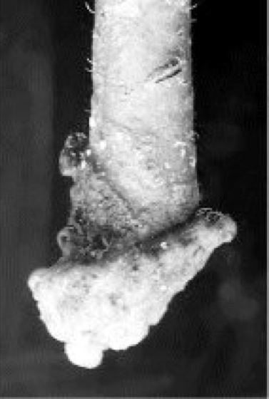 Kallusm [von latein. callus = Schwiele], Callus, 1) Botanik: a) Bezeichnung für pflanzliches Wund- (Wundheilung) und Vernarbungsgewebe, das als Gewebewulst durch starke Vermehrung aller an der Wundfläche grenzenden, lebenden Zellen, besonders aber der Kambiumzellen (Kambium), entsteht ( vgl. Abb. ). Nach außen schützt sich das Kallusgewebe durch alsbaldige Ausbildung eines Korkkambiums in der Peripherie. Größere Wunden werden überwallt (Überwallung), wie z.B. Abbruchstellen von Ästen, ausgedehnte Wunden, die am Stamm bis zum Holzkörper reichen. Kallusgewebe bildet sich auch bei Pfropfungen zur Veredelung an der Verwachsungsstelle zwischen Reis und Unterlage. Aus Kallusgewebe können neue Sproß- und Wurzelanlagen gebildet werden, wie abgesägte Pappeln und Weiden häufig demonstrieren. Gummifluß, Organogenese, Regeneration. b) schwielenartige Verdickung, z.B. auf der Lippe vieler Orchideen. 2) Zoologie: auf der Spindelseite ausgebildete, kalkige Verdickung an der Mündung des Schneckenhauses. 3) Medizin: Knochenkeimgewebe, das nach Knochenbrüchen die Bruchlücke ausfüllt; ist zunächst unverkalkt und wird erst durch Kalkeinlagerung fest. Knochen.
