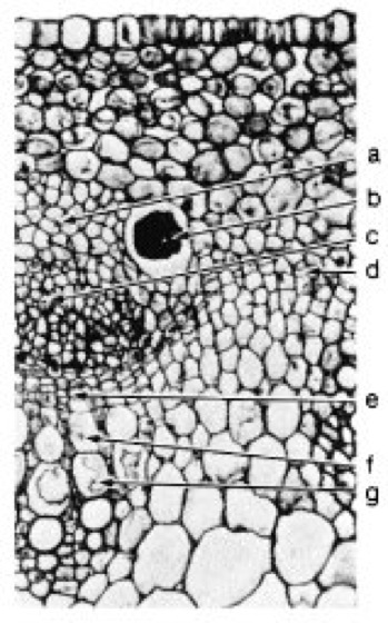 Kambium im Stengel des Hornklees; a altes, funktionsuntüchtiges Phloem, b Tanninzellen, c funktionstüchtiges, jüngeres Phloem, d intrafaszikuläres und e faszikuläres Kambium, f und g noch unreife Tracheenglieder