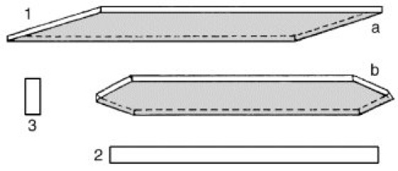 Schema der Zellform des Kambiums (in der Abb. ist die Sproßachse waagerecht liegend zu denken): 1a und b räumliche Wiedergabe der beiden häufigsten Zellformen; 2 tangentiale Breitseite und 3 Querschnitt einer Kambiumzelle