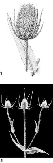 1 Blütenkolben und Stengelblatt der Wilden Kardendistel (Dipsacus sylvestris);2 Weber-Kardendistel (Dipsacus sativus)