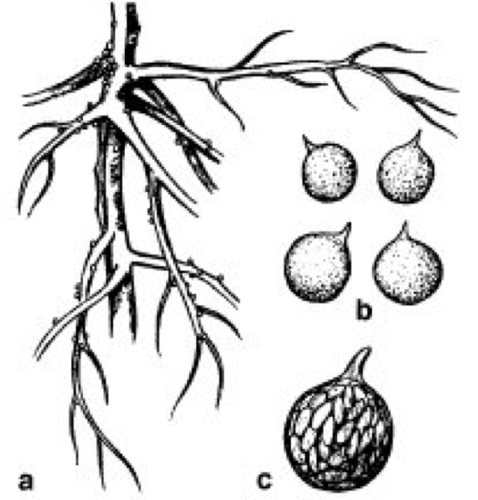 a mit Cysten besetzte Wurzeln, b Cysten stark vergrößert, c Cyste mit Eiern