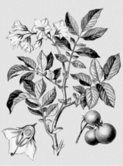 Blütenzweig der Kartoffelpflanze; links unten Einzelblüte, rechts unten die grünen, ungenießbaren Früchte
