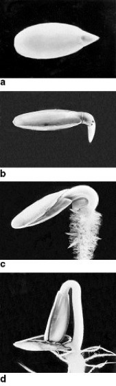 a ruhender Same: Für die Keimung ist eine Wasseraufnahme nötig. Durch die Quellung des Sameninhalts entsteht ein innerer Druck, der eine Öffnung der Samenschale (Testa) ermöglicht. b beginnende Keimung: Die geotrop wachsende Keimwurzel (Radicula) durchstößt die Samenschale. c Differenzierung im Wurzelbereich: die Rhizodermiszellen wachsen zu schlauchförmigen, dünnwandigen Ausstülpungen (Wurzelhaare) aus, über die vermehrt Wasser aufgenommen werden kann. Gleichzeitig bilden sich die ersten Seitenwurzeln. Das zwischen Wurzeln und den beiden Keimblättern liegende Hypokotyl beginnt bogenförmig zu wachsen. d Streckungswachstum des Hypokotyls: die Basis des Hypokotyls streckt sich, der Hypokotylhaken durchbricht das Erdreich und zieht in seinem Schutz die Keimblätter nach. Die Keimwurzel hat sich zur Hauptwurzel mit Nebenwurzeln weiterentwickelt. Am Wurzelhals sind noch die Reste der Samenschale zu erkennen.