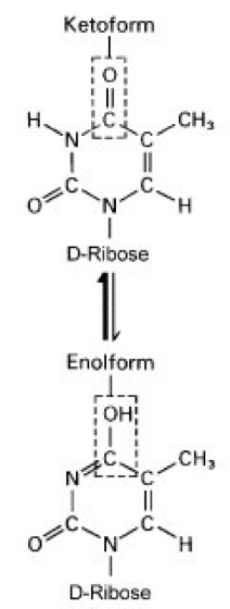Keto-Enol-Tautomerie bei Thymidin: Das Gleichgewicht liegt praktisch vollständig (105) bei der oberen Form. Es wird aber angenommen, daß die seltene, untere Form bei der Entstehung von Mutationen von Bedeutung ist, da sie andere Paarungseigenschaften aufweist.