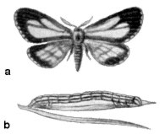 Kiefernspanner, Bupalus piniaria, eurasiatisch verbreiteter, häufiger Schmetterling aus der Familie Spanner; Falter ( vgl. Abb. ) stark geschlechtsdimorph: Männchen schwarzbraun mit weißlich-gelben Aufhellungen, Fühler gekämmt; Weibchen dunkelbraun mit rostgelben Flecken, Fühler borstenförmig; Spannweite 30–40 mm, Flügel in Ruhe tagfalterartig aufgerichtet, Flugzeit von April bis Juli, tagaktiv; Eiablage in einreihigen Zeilen an Nadelunterseite von Kiefern, seltener anderen Koniferen; Raupen grün mit hellen Längsstreifen, bei Massenauftreten bedeutsamer Forstschädling, Puppe überwintert im Boden.