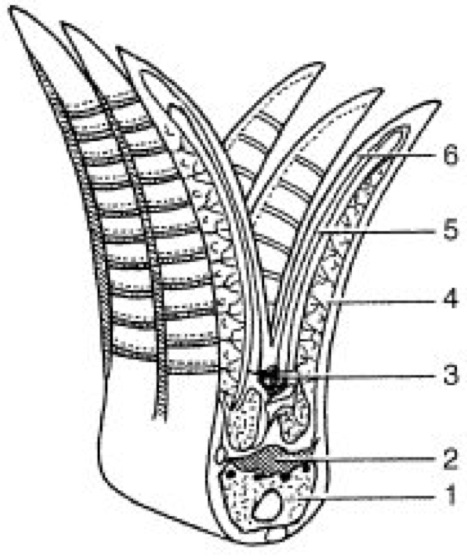 Ausschnitt aus einem Kiemenbogen mit 6 ansitzenden Kiemenblättern; 1 knöcherner Kiemenbogen, 2 Kiemenbogenvene, 3 Kiemenbogenarterie, 4 Kiemenblattvene, 5 knorpeliger Kiemenstrahl, 6 Kiemenblattarterie