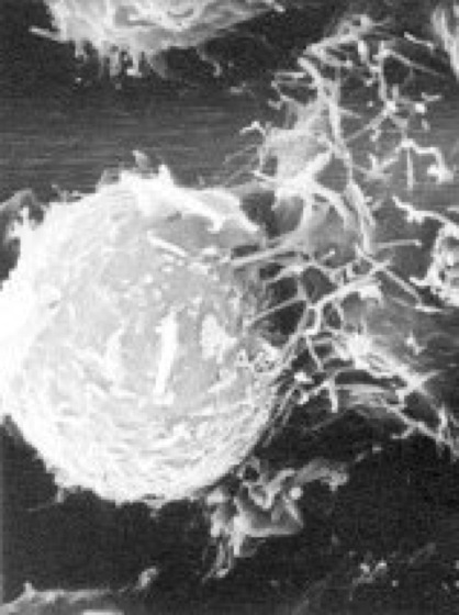 Killer-T-Zelle (rechts) bei der Kontaktaufnahme mit einer Tumorzelle