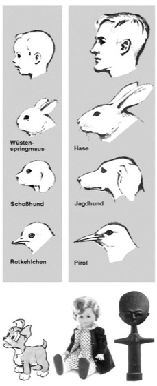 Kindchenschema, eine Kombination von Körper-Merkmalen, die beim Menschen und verschiedenen anderen Primaten zum unmittelbaren Erkennen eines jugendlichen oder kindlichen Entwicklungsstands (kindliche Entwicklung) führt und in der Regel positive Gefühlsreaktion und Zuwendung, gegebenenfalls auch Betreuung und Pflegeverhalten, veranlaßt ( vgl. Abb. ). Charakteristika des Kindchenschemas sind ein vergleichsweise großer Kopf mit ausgeprägter Stirnwölbung und Hinterkopf, große, tief angeordnete Augen, kleiner Nasen- und Kinnbereich, kurze Extremitäten, unbeholfene Bewegungen usw. Das Kindchenschema wurde von K. Lorenz beschrieben und als Beispiel für einen angeborenen auslösenden Mechanismus (AAM, in diesem Fall für Brutpflegereaktionen; Brutpflege) beim Menschen betrachtet; ein endgültiger Nachweis fehlt jedoch. Das Kindchenschema wird in der Werbung ebenso benutzt wie bei Spielzeugfabrikationen und Comic-Zeichnungen, um eine positive Gefühlsreaktion und Kaufbereitschaft zu veranlassen. Aggressionshemmung, Attraktivität, Betreuung, Jugendkleid.