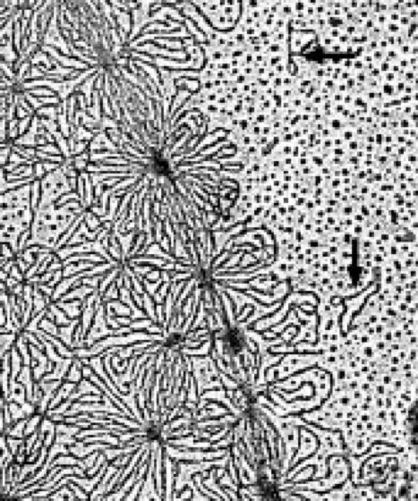 Elektronenmikroskopische Aufnahme eines Ausschnitts des aus ineinander greifenden Mini- und Maxiringen gebildeten DNA-Netzwerks. Die 2 Pfeile markieren einzeln liegende Miniringe.