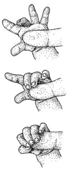 Handgreifreflex (der typische Klammerreflex junger Primaten) beim menschlichen Neugeborenen. Beim Kind stellt der Handgreifreflex ein Verhaltensrudiment ohne äußere Funktion dar, das die stammesgeschichtliche Herkunft des Menschen von den Primaten verrät.