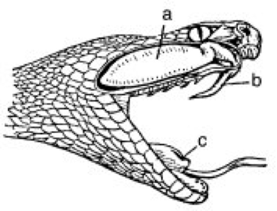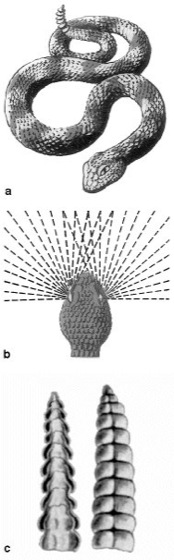 Abb. 2: a Habitus der Klapperschlange. b Die sich überschneidenden Gesichtsfelder der beiden Grubenorgane (Infrarotaugen); die Empfindlichkeit dieser Wärmerezeptoren ist so groß, daß eine Erhöhung der Temperatur um 3/1000 C durch eine Maus in 15 cm Entfernung noch registriert werden kann. c „Rassel“, links von innen, rechts von außen gesehen; sie wird von dünnen, mitochondrienreichen Muskeln in Abhängigkeit von der Außentemperatur schneller oder langsamer bewegt, z.B. 23mal/s bei 10 C und 85mal/s bei 35 C.