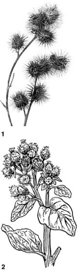 1 Klette (Arctium spec.),2 Kleine Klette (Arctium minus)