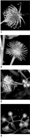 1 Echte Nelkenwurz (Geum urbanum), 2 Klette (Arctium spec.),3 Schneckenklee (Medicago spec.),4 Waldmeister (Asperula odorata)