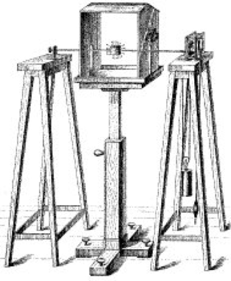 Historische Abb. eines frühen Klinostaten, bei dem die Drehachse noch mittels Pendel und Gewicht angetrieben wurde.