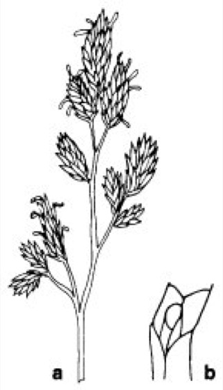 Wiesen-Knäuelgras (Dactylis glomerata),a Blütenstand, b Blattgrund