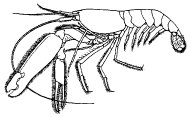 Knallkrebse, Pistolenkrebse, Alpheidae, Familie der Caridea mit 23 Gattungen und 425 Arten; kleine, 3–5 cm lange Garnelen (Natantia), deren erste Pereiopoden sehr asymmetrische Scheren bilden. Alpheus (mit ca. 140 Arten; vgl. Abb. ) und Synalpheus (mit ca. 90 Arten) sind die eigentlichen Knallkrebse. Sie leben im Litoral warmer Meere. Die große Schere ist oft länger und größer als der Cephalothorax, manchmal so lang wie der ganze Krebs. Mit dieser Schere können die Knallkrebse ein lautes Knallen erzeugen: Ihr unbeweglicher Finger besitzt eine Längsrinne, die in einer Vertiefung endet; der bewegliche Scherenfinger hat einen Vorsprung, der beim Schließen der Schere plötzlich wie ein Druckknopf in diese Grube einschnappt; dadurch werden ein nach vorn gerichteter Wasserstrahl mit hohem Druck und ein Knall erzeugt ( vgl. Infobox ), der bei in Massen auftretenden Krebskolonien die Sonardetektion, z.B. beim Detektieren von U-Booten, massiv stören kann. Knallkrebse leben in Röhren, die sie sich selbst graben oder die sie erkämpfen. Bei solchen Kämpfen wird dem Gegner der Wasserstrahl entgegengeschossen; vor allem in der Abenddämmerung nehmen solche Auseinandersetzungen zu, und man hört ein lautes Knattern. Auch beim Beutefang kann der Wasserstrahl eingesetzt werden (Betäubung von Fischen). Manche Arten leben paarweise in ihren Röhren. Andere leben in Symbiose mit einem Fisch der Familie Gobiidae (Grundeln); der Krebs gräbt die Röhre, und der Fisch beobachtet die Umgebung und gibt durch bestimmte Bewegungen an, ob der Krebs die Röhre ohne Gefahr verlassen kann. Viele Arten von Synalpheus leben in Schwämmen ( vgl. Infobox ). Athanas nitescens, ein 2 cm langer Alpheide aus der Nord- und Ostsee, kann nicht knallen.