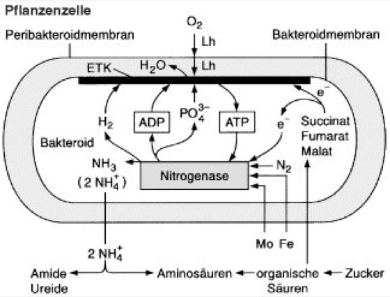Abb. 2: Schematische Darstellung der N2-Fixierung und des Transports einiger Stoffwechselprodukte zwischen Pflanzen- und Bakterienzelle (Rhizobium leguminosarum) in den Wurzelknöllchen. Der Luftstickstoff (N2) wird durch die Bakterien zu Ammoniak (NH3) reduziert, das in die Pflanzenzelle gelangt und zu Glutamin und Asparagin oder Ureiden (Allantoin, Allantoinsäure) assimiliert und in dieser Form transportiert wird. (ETK = Elektronentransportkette der Atmung, Lh = Leghämoglobin).