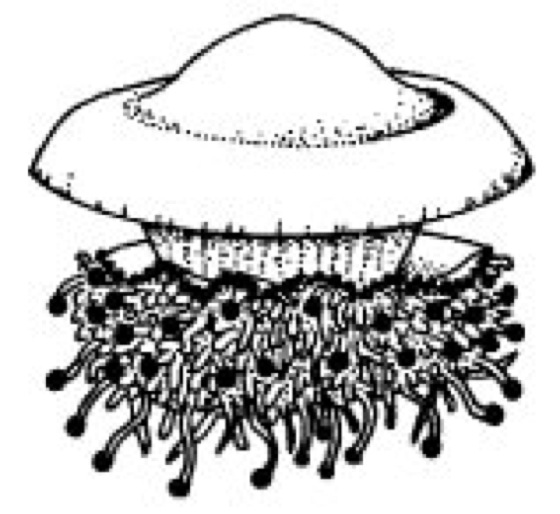 Knollenqualle, Cotylorhiza tuberculata, Art der Wurzelmundquallen; lebt im Mittelmeer und erreicht 35 cm Durchmesser; ihr flacher Schirm ist goldgelb oder bräunlich gefärbt; die Mundlappen sind stark gekraust, dazwischen ragen „violett geknöpfte" Tentakel hervor ( vgl. Abb. ). Im Schirm leben häufig symbiontische Zooxanthellen.
