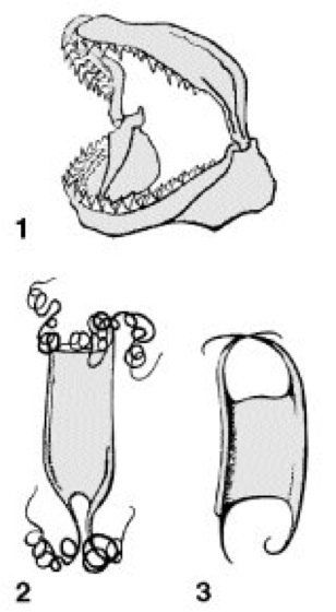 1 Kieferskelett eines Haies mit hintereinander gelagerten Zahnreihen, 2 Ei eines Katzenhaies mit Haftfäden, 3 Ei des Sternrochens