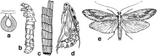 Abb. 1: Entwicklungsstadien von Vertretern der Phryganeidae:a Laichkranz, b Larve, c Larvenköcher, d Puppe, e Imago (a, b, c, e Phryganea grandis, d Neuronia ruficrus)