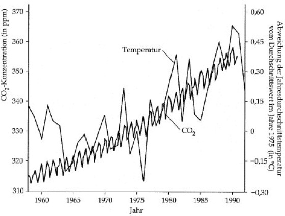 CO2-Gehalt der Erdatmosphäre und Durchschnittstemperaturen von 1958–1992, gemessen am Mauna Loa Observatorium (Hawaii). Neben den jahreszeitlichen Schwankungen ist eine stetige Zunahme des CO2-Gehalts erkennbar. Im gleichen Zeitraum zeichnet sich trotz der stark schwankenden Durchschnittstemperaturen ein Erwärmungstrend ab.