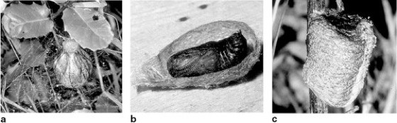 Abb. 1:a Eierkokon der Radnetzspinne Argiope bruennichi,b aufgeschnittener Puppenkokon des Kleinen Nachtpfauenauges (Eudia pavonia),c Eikokon der Gottesanbeterin (Mantis religiosa)
