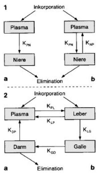 a Zwei-Kompartiment-Modell (z.B. renal eliminiertes Radionuklid). b Zwei-Kompartiment-Modell mit intrarenaler Rückresorption des Pharmakons. 2 Vier-Kompartiment-Modell mit enterohepatischer Anreicherung und enteraler Elimination. K = Verteilungskoeffizient zwischen den Kompartimenten