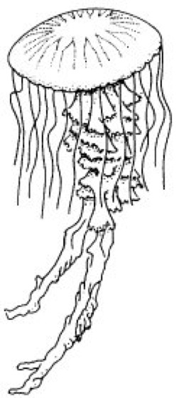 Kompaßqualle, Chrysaora hyoscella, Art der Fahnenquallen mit ca. 30 cm Durchmesser, im Atlantik, Mittelmeer und in der Nordsee oft in Scharen. Der Körper ist hellgelb oder weiß gefärbt, von der Mitte des Schirms laufen 16 braune Streifen symmetrisch zum Schirmrand, die manchmal auch fehlen können; der Schirmrand trägt 24 lange Tentakel ( ß vgl. Abb. ). Die stark gekräuselten Mundarme können bis 2 m lang sein. Kompaßquallen sind meist als Jungtiere männlich, werden dann zwittrig und danach weiblich. Die Eier werden als Planula-Larven (Planula) aus dem Magenraum entlassen; sie entwickeln sich zu Scyphopolypen, die über die Bildung von Ephyra-Larven (Ephyra) wieder Medusen hervorbringen. Die Polypen können sich ungeschlechtlich vermehren, ihre Fußscheiben können zu Überdauerungsstadien werden.