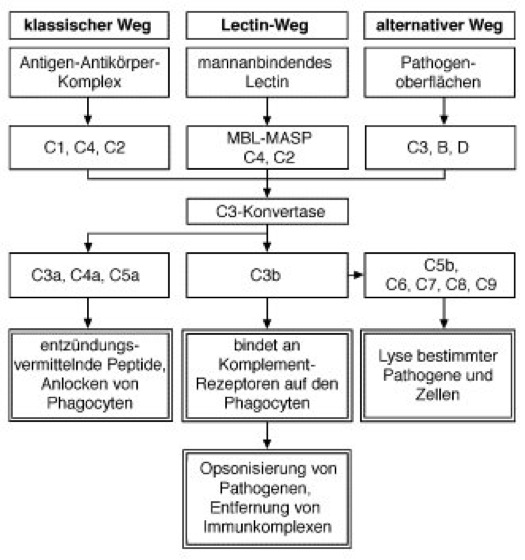 Die 3 Wege der Komplement-Aktivierung beruhen auf einer Bindung der frühen Komplement-Faktoren an die Oberfläche von Pathogenen. Diese Faktoren sind evolutiv miteinander verwandt und verfügen über Protease-Aktivitäten, die durch die Bindung aktiviert werden. Durch die Spaltung der Faktoren und die Bindung der jeweils größeren Spaltprodukte (C4b/C2b bzw. C3b/Bb) an die Pathogene entstehen C3-Konvertasen, die weitere C3-Moleküle in C3a und C3b spalten. C3b wirkt als Opsonin, bindet an Komplement-Rezeptoren auf Phagocyten und leitet so die Beseitigung von Pathogenen und Immunkomplexen ein. Darüber hinaus komplexiert C3b mit C4b/C2b zur C5-Konvertase. Die C5-Konvertase spaltet C5 in C5a und C5b, welches ebenfalls an die Pathogen-Oberfläche bindet. An C5b lagern sich in Folge nacheinander C6, C7, C8 und mehrere Moleküle von C9 an. Diese Proteine bilden gemeinsam den membranangreifenden Komplex, einen Kanal in der Zellmembran des Pathogens. Durch diesen Kanal werden wesentliche Stoffwechsel- und energetische Prozesse des Pathogens gestört, was dessen Absterben bewirkt. Die Fragmente C3a, C4a und C5a sind biologisch aktive Peptide, die eine Entzündungsreaktion (Entzündung) einleiten.