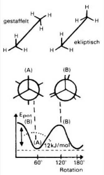 Änderung der inneren („potentiellen“) Energie Epot des Ethans (C2H6) bei Rotation der beiden CH3-Teile um die Einfachbindung. Die Konformation B ist energiereich, dagegen hat das Konformere A minimale Energie. Die Kurve, die den Energieinhalt der Konformeren des Ethans veranschaulicht, weist daher Minima und Maxima auf. Energieminimum haben die Konformationen, bei denen die H-Atome des Ethans auf „Lücke“, d.h. gestaffelt, angeordnet sind (A). Maximalen Energieinhalt hat die Konformation, bei der die H-Atome der beiden C-Atome einander genau gegenüberstehen. Das Konformere hat die ekliptische Form (B).