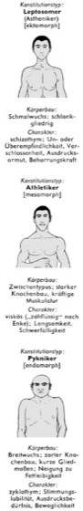 Menschliche Konstitutionstypen nach Kretschmer: Körperbau und Charakter; zum Vergleich Typenbezeichnung nach W.H. Sheldon [in eckigen Klammern]