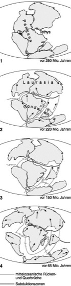 Veränderung von Lage und Form der Kontinente auf der Erde im Laufe der Erdgeschichte: 1 Ende des Paläozoikums (vor ca. 250 Millionen Jahren), 2 Ende der Trias (vor ca. 220 Millionen Jahren), 3 Ende des Jura (vor ca. 150 Millionen Jahren), 4 Ende der Kreide (vor ca. 65 Millionen Jahren)