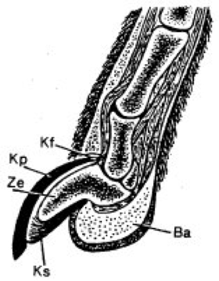 Bekrallte Zehe des Hundes (Längsschnitt); Ba Ballen, Kf Krallenfalz, Kp Krallenplatte, Ks Krallensohle, Ze Zehenendglied