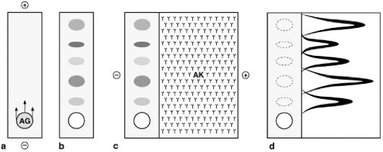 Schematische Darstellung. Zunächst wird das zu untersuchende Antigengemisch (z.B. Serum) auf ein Agargel aufgetragen und elektrophoretisch aufgetrennt (a). Das Ergebnis dieser Elektrophorese ist in Abb. b dargestellt. In einem zweiten Schritt wird an das reine Agargel, das die aufgetrennten Proteine enthält, ein antikörperhaltiges Agargel anpolymerisiert. Anschließend wird, versetzt um 90 zur ersten Elektrophoreserichtung, erneut eine elektrophoretische Trennung durchgeführt (c). Bei dieser zweiten Elektrophorese tritt das gesuchte Antigen mit den im Gel enthaltenen Antikörpern in Wechselwirkung. Es kommt zu einer Präzipitation von Antigen-Antikörper-Komplexen. Je mehr Antigen in der Probe enthalten ist, desto länger wird das raketenförmige Präzipitat (d). Ein Vergleich mit Standard-Präzipitaten erlaubt somit die Quantifizierung des gesuchten Antigens. AG = antigenhaltige Analysenlösung, AK = antikörperhaltiges Agargel.