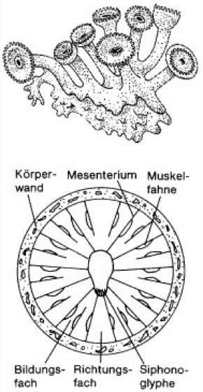 Krustenanemonen, Zoantharia, Ordnung der Hexacorallia (Sechsstrahlige Korallen) mit ca. 300 Arten ( vgl. Abb. ). Die größte Art ist Isozoanthus giganteus mit 19 cm Länge bei einem Durchmesser von 2 cm. Krustenanemonen, die meist flächige, krustenförmige Kolonien bilden, scheiden kein eigenes Skelett ab. Sie sezernieren einen Schleim, in dem Fremdpartikel festkleben und der als eine Art Skelett von der Epidermis umwachsen wird. Die Polypen sind nur 1–2 cm groß. Die Kolonien besiedeln feste organische und anorganische Unterlagen besonders in den Uferzonen. Einzelpolypen stecken einfach im Sand. Charakteristisch ist die Neubildung von Mesenterien, die, im Gegensatz zu den Seerosen, nur in 2 von einem Richtungsfach getrennten Zwischenfächern erfolgt. Die meisten Krustenanemonen kommen in subtropischen und tropischen Meeren vor, nur einige Arten auch im Mittelmeer und den nördlichen Meeren. Parazoanthus axinellae (gelbe Krustenanemone) lebt im Mittelmeer u.a. auf Schwämmen der Gattung Axinella und auf Microcosmus. Epizoanthus arenaceus (graue Krustenanemone) auf Schneckenschalen, Manteltieren und Hornkorallen. Interessant ist die Lebensweise von Epizoanthus incrustatus (Nordsee). Sie bildet ihre Krusten vor allem auf den Schneckengehäusen von Einsiedlerkrebsen. Dabei wird das Haus vollständig überwachsen und aufgelöst, so daß der Krebs schließlich nur in der Kruste der Epizoanthus-Kolonie sitzt. Arten der Gattung Mammillifera bilden scheibenförmige Kolonien. Sie werden von dem Einsiedlerkrebs Paguropsis typica mit dem 4. Abdomenbeinpaar gepackt und wie eine Hose über den Hinterleib gezogen. Spezielle Dornen halten die Kolonie. Palythoa toxica, eine Art tropischer Meere, produziert das hochgiftige Palytoxin (Coelenteratentoxine).