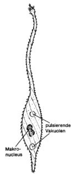 Lacrymariaw [von latein. lacrima = Träne], artenreiche Gattung der Gymnostomata; langgestreckte Wimpertierchen ( vgl. Abb. ), die in Kopf, sehr dehnbaren Hals und Rumpf gegliedert sind; leben räuberisch in nährstoffreichen Gewässern von anderen Protozoen. Eine häufige Art ist Lacrymaria olor (Schwanenhalstierchen), die mit gestrecktem Hals bis 1,2 mm lang ist; liegt bei der Nahrungssuche fest und tastet mit dem Kopf nach Beute.