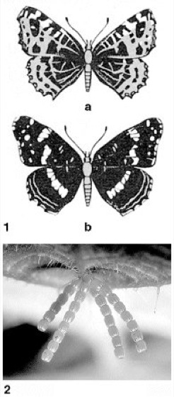 Landkärtchen, Gitterfalter, Netzfalter, Araschnia levana, eurasiatisch verbreitete Art der Fleckenfalter; Name aufgrund der fein strukturierten Zeichnung der Flügel-Unterseiten. Das Landkärtchen tritt in 2 unterschiedlich gefärbten Saisonformen (Generationsdimorphismus, Saisondimorphismus) auf, die C. von Linné noch als verschiedene Arten beschrieb; die Entstehung ist durch den Umweltfaktor Tageslänge (Lichtfaktor) determiniert, nicht genetisch fixiert (daher korrekter als Saisondiphänismus zu bezeichnen): im Frühjahr fliegt die Form levana, gelbbraun mit schwarzen Flecken und Binden auf den Flügeln, Spannweite um 35 mm; im Sommer erscheint die etwas größere Form prorsa, schwarz mit weißer Binde und Fleckung ( ä vgl. Abb. ). Die Falter fliegen im Flachland und Mittelgebirge in jahrweise wechselnder Häufigkeit in hochstaudenreichen Auwäldern, Waldlichtungen, Schlägen und halbschattigen feuchten Laubwäldern; saugen bevorzugt an Doldenblütlern, Disteln, Dost und anderen Hochstauden; perlschnurartige Eigelege ( ä vgl. Abb. ) an Brennessel; daran leben die typisch schwarzen Dornraupen gesellig; die Herbstpuppe überwintert. Saisondimorphismus (Abb.); ä Ernährung , Fleckenfalter .